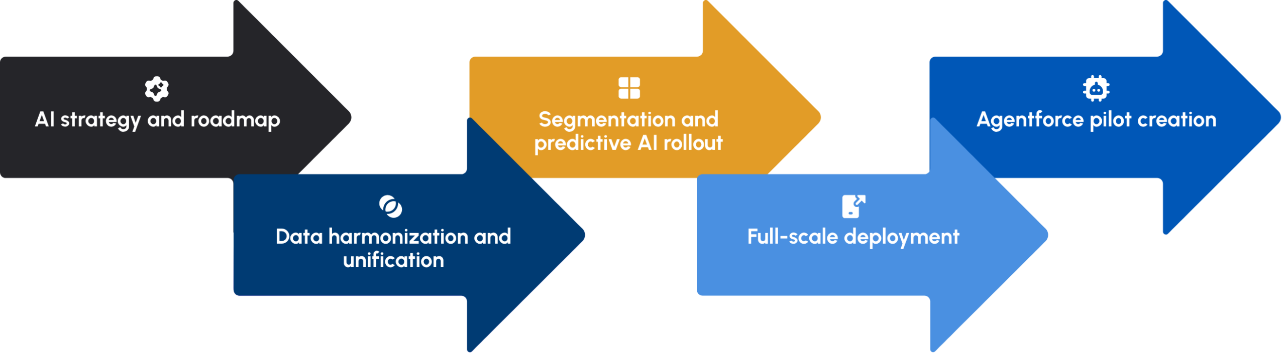 There is no single timeline or sequence for Data Cloud and AI implementations. Some agentic use cases can be deployed quickly using existing Salesforce data, while broader predictive and personalization capabilities benefit from Data Cloud as data maturity increases. We prioritize use cases that deliver early value and sequence capabilities accordingly.